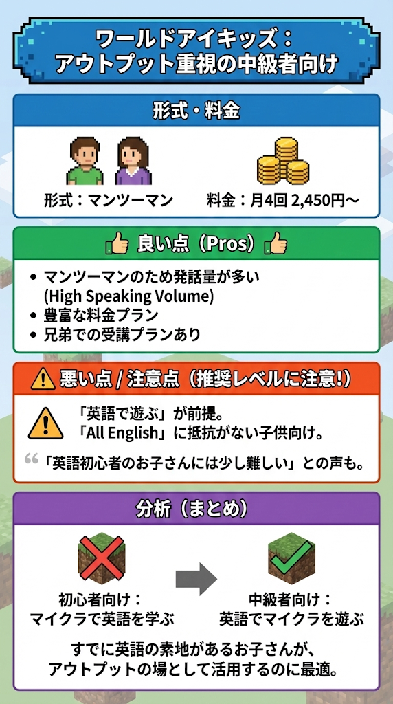 ワールドアイキッズは「マイクラで英語を学ぶ(初心者向け)」というより、「英語でマイクラを遊ぶ(中級者向け)」スクールです。すでに英語の素地があるお子さんが、アウトプットの場として活用するのに最適と言えます。